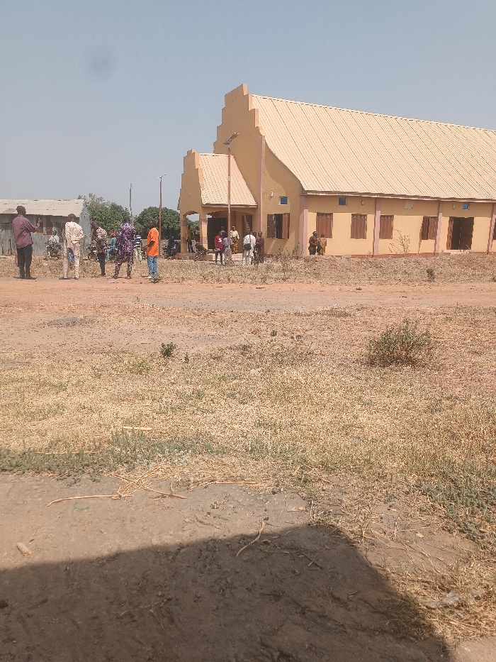 The image depicts an outdoor scene in Rigachikun, Nigeria, under a clear, bright sky. The central feature is a large, light-tan colored building with a cream-colored corrugated metal roof. The building features a stepped gable facade on the left and a longer, sloped roofline extending to the right. Multiple rectangular windows with dark brown shutters are visible along the right side. An entrance area is present under a smaller roof section on the left, where a solar-powered light pole stands. Approximately 15-20 individuals, primarily adults, are gathered around the entrance and to the left of the building, dressed in various casual and traditional clothing. Some are standing, appearing to converse, while others are seated. To the far left, a smaller structure with a corrugated metal roof is partially visible, and a motorcycle is present near it. The foreground consists of dry, bare earth with sparse patches of dried, light-colored grass and small green plants. A dark shadow extends across the lower left corner of the frame.