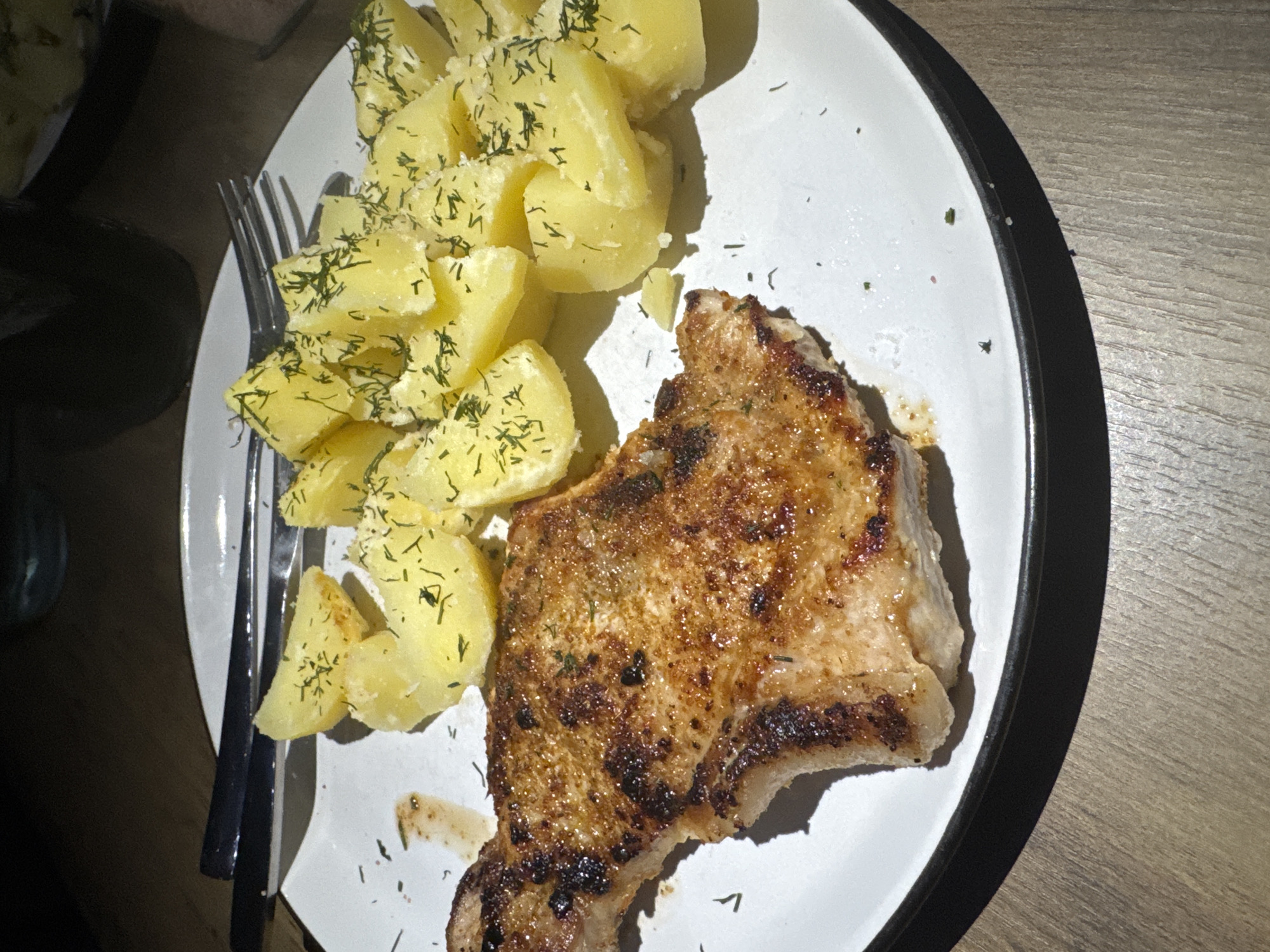 The image depicts a plate of food consisting of a pork chop and boiled potatoes. The pork chop is browned and appears to be well-cooked. The potatoes are cut into chunks and sprinkled with dill. A fork rests next to the potatoes on the plate. The plate has a white surface and a black rim. The plate is positioned on a wooden surface. The image does not show any location and it is not possible to confirm its location in Great Yarmouth, United Kingdom or anywhere else.
