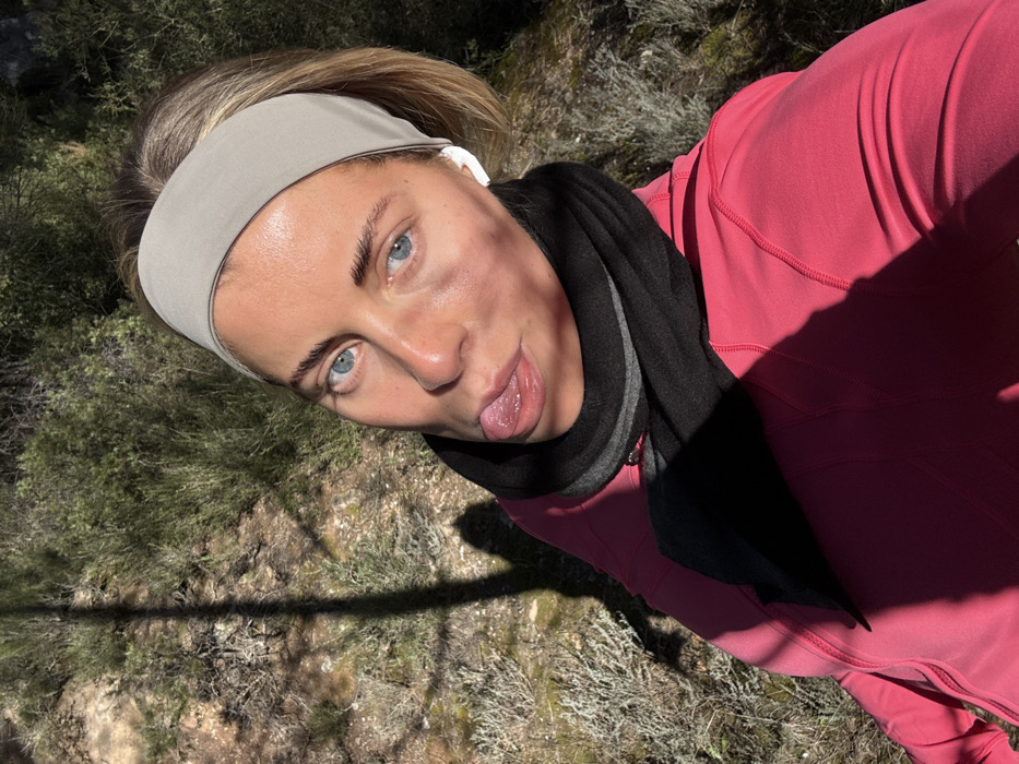 An adult female is depicted outdoors, likely in a natural environment bordering Rousset, France. She has fair skin, blue eyes, and light brown hair held back by a light grey headband. She wears a black scarf and a bright pink long-sleeved athletic top. A white wireless earbud is visible in her right ear. Her tongue is slightly extended from her mouth as she looks directly into the camera, indicative of a selfie or close-up portrait. The background features sparse, dry vegetation and earth, consistent with scrubland under strong, direct sunlight. Distinct shadows are cast on the ground, including a prominent thin, vertical shadow, and the subject's own shadow falls across her pink top.