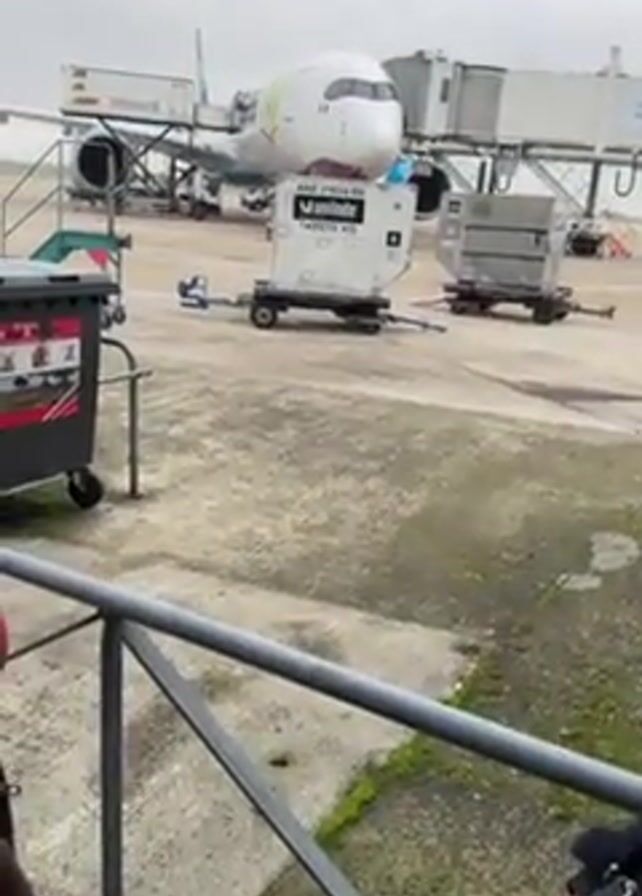 n airplane parked at a terminal, with ground support equipment nearby. The plane has a white body with colorful accents, and is connected to the terminal via a jet bridge. In the foreground, there's a metal railing, a trash can, and a person partially visible on the right side of the frame. Two white cargo containers on small trailers are positioned on the concrete ground between the railing and the airplane. The ground is cracked and stained. The sky appears overcast. The text on the cargo containers reads "unilode" and "TARE 58 KG".
