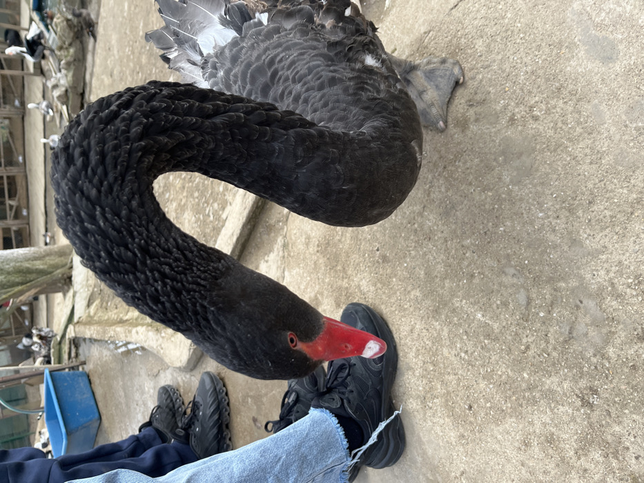 - "The image presents an outdoor scene in Leskovets, Bulgaria, depicting a close interaction between a black swan and two individuals" by FM-GdSvQ2, licensed under CC BY 4.0