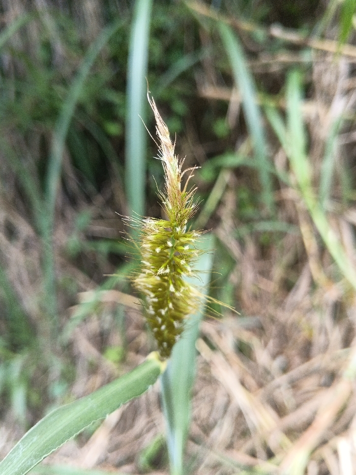 A close-up shot shows a vibrant green grass seed head, bristling with fine, hair-like structures. Its top part transitions to a tan, feathery texture. The seed head arises from a single, wide, green leaf. Blurred in the background are other blades of grass and some brown vegetation. The overall impression is of a natural, uncultivated setting.
