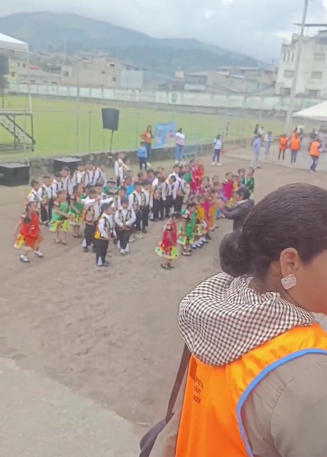 large group of young children performing a traditional dance outside. Most of the boys are wearing white shirts, black pants, and embroidered vests. The girls are wearing colorful skirts and tops. They are all moving in time with the music, although some of them appear a little disoriented. Behind them is a green fence, a grassy field, and some buildings. There are some adults standing around watching the performance. In the foreground, an adult with their back to the camera is wearing an orange vest.