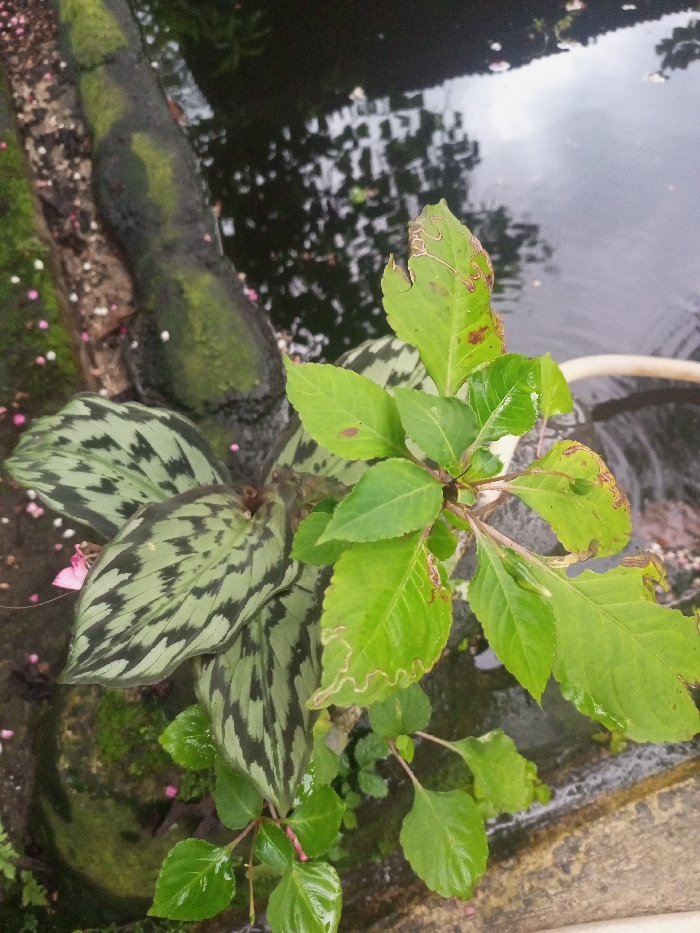 The image depicts a close-up, downward-angled view of a cultivated outdoor area in Bamhori, India, featuring flora adjacent to a water body. In the foreground, two distinct plant species are dominant. To the left, a plant displays multiple broad, ovate leaves characterized by a light green base with dark green, chevron-like patterns. A single pink petal is visible near the lower left leaf. To the right, another plant branch features smaller, uniformly green leaves, several of which exhibit brown lesions, holes, and light-colored, serpentine leaf miner trails. The background consists primarily of a dark body of water, reflecting ambient light and indistinct shapes of overhead foliage or structures. Scattered white and pink particulate matter, consistent with fallen petals or debris, floats on the water's surface. Along the left perimeter of the water, a dark, moss-covered, elongated object, possibly a log or concrete element, is partially visible, with similar white and pink debris on the adjacent ground. A light-colored hose or pipe is partially visible along the right edge of the water. A light-colored concrete or stone border defines the immediate lower right edge of the water. No individuals are present.