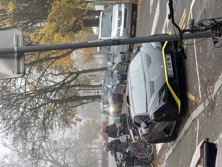 An urban street scene in Strasbourg, France, is depicted on an overcast, hazy day, likely during late autumn or early winter, as evidenced by trees with sparse yellow foliage and bare branches. In the foreground, a black Lamborghini Huracán STO with prominent yellow aerodynamic accents on its front splitter, side skirts, and rear spoiler is parked diagonally towards the curb. Its French license plate reads "GZ-406-ME". Partially obscuring the car's right side and extending into the foreground is a dark metallic utility pole, and the handlebars of a black bicycle are visible in the immediate lower right. In the lower left foreground, a segment of a brown-orange trash receptacle is visible. On the sidewalk to the left of the Lamborghini, a cluster of various bicycles is parked. Two adult males are visible in the mid-ground near these bicycles; one, with gray hair, wears a dark jacket and a backpack, standing near a bicycle, while another man with gray hair in a dark jacket is also present. Behind the Lamborghini, a line of vehicles is parked parallel to the curb, extending into the background. These include a silver Volkswagen van with the French license plate "494 BBP 67" and a blue BMW sedan, among other cars. Some vehicles in the mid-ground exhibit illuminated headlights. The street features yellow painted lines marking parking or traffic zones. Deciduous trees with sparse, yellowing leaves or bare branches line the street, creating a canopy that recedes into the atmospheric haze.