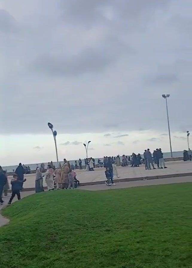park area next to a beach on a cloudy day. Numerous people are walking along the paved area near the beach. There are lamp posts along the walkway. The park area has green grass, and a sign is visible. Several boys are walking on the grass. In the background, there's a mountain and a white building with blue accents.