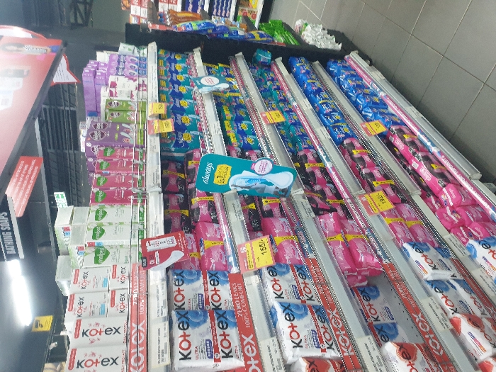 The image depicts a well-lit retail aisle within a supermarket or store, located in Machakos Central ward, Kenya