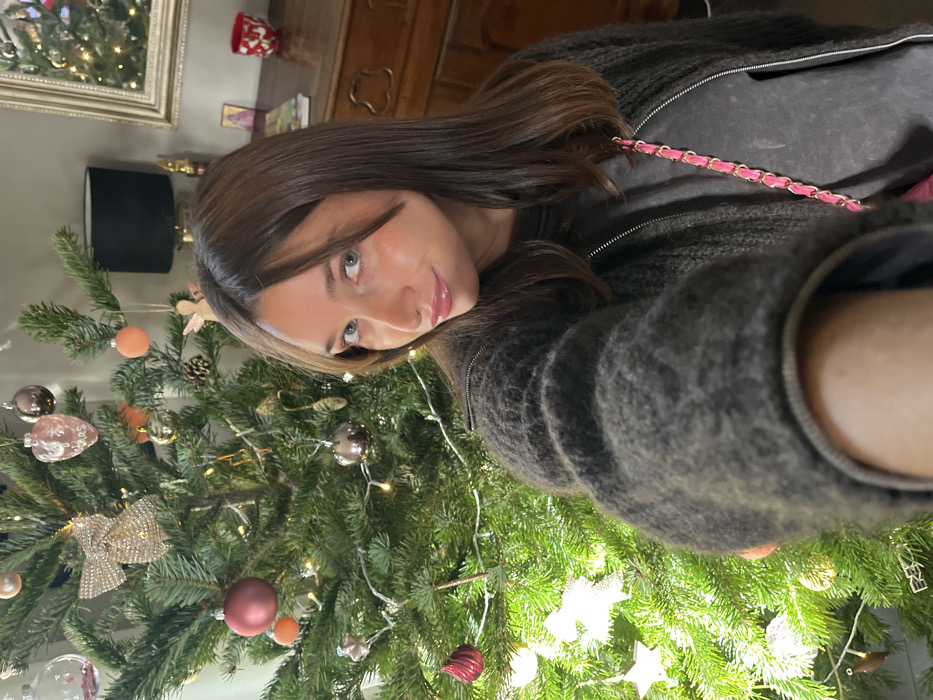 A female individual is depicted taking a selfie indoors, presumed to be in the city of Marseille, France. She has long brown hair with lighter highlights, blue eyes, and glossy pink lips, looking directly at the camera with a slight smile. She is wearing a dark grey, textured, zippered cardigan over a dark grey t-shirt, with a bright pink chain-strap bag visible across her torso. The background features a decorated Christmas tree to her left, adorned with warm white string lights, various spherical ornaments (pink, peach, clear), a large sparkly bow, pinecones, and small star-shaped lights. To her right, a dark brown wooden cabinet holds a table lamp with a black shade, a framed mirror with an ornate gold frame, a stack of books, a red patterned mug, and a small framed image. The wall behind the cabinet is a light neutral color.