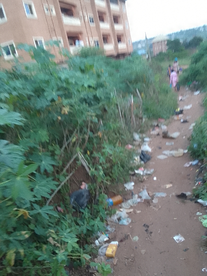 The image depicts an unpaved, reddish-brown dirt path in the city of Unknown, Unknown. The path, visible from a slightly elevated perspective looking down, is heavily littered with various refuse, including plastic bags (black, white, clear), plastic bottles (e.g., amber, clear with blue cap), and cardboard fragments (e.g., a yellow box). Dense, green, overgrown vegetation, including large-leafed plants in the foreground, flanks both sides of the path. In the background, to the left, a multi-story building with a light brown/tan facade, multiple windows, and balconies is partially visible. Further down the path, in the distance, at least three individuals are walking away from the viewer. One individual is wearing a pink garment, another a light-colored top, and the third appears to be in darker clothing. Additional indistinct buildings are visible in the far background. The sky is overcast.