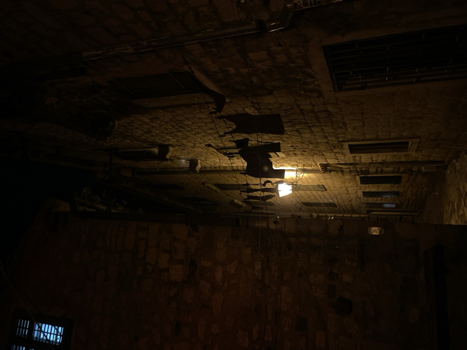 A dimly lit interior reveals a textured, brick ceiling with several dark openings and a central light fixture. Shadows obscure much of the room, yet the rough texture of brick walls are visible below. A small window with bars is seen on the left side. The scene suggests an old, perhaps underground, space.