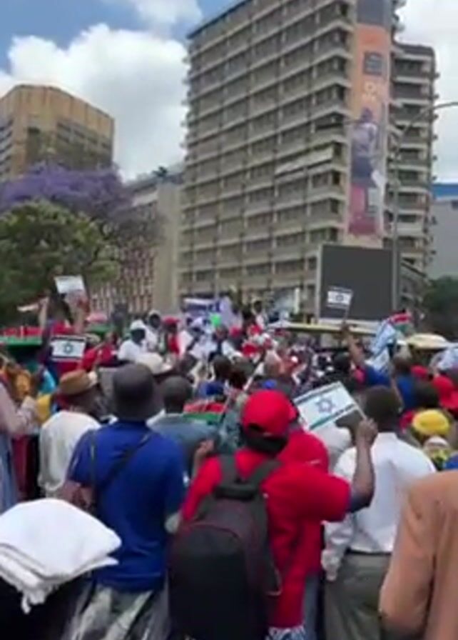 A crowd of people are gathered on a city street. They appear to be cheering and waving small flags, some of which appear to be Kenyan flags. The crowd is diverse in terms of age and dress, with many wearing red or blue shirts. The camera is positioned within the crowd, looking towards a raised platform or vehicle where other people can be seen. Buildings of varying heights are visible in the background, including a tall building with a large advertisement. There is also a statue visible near the crowd. The sky is partly cloudy.
