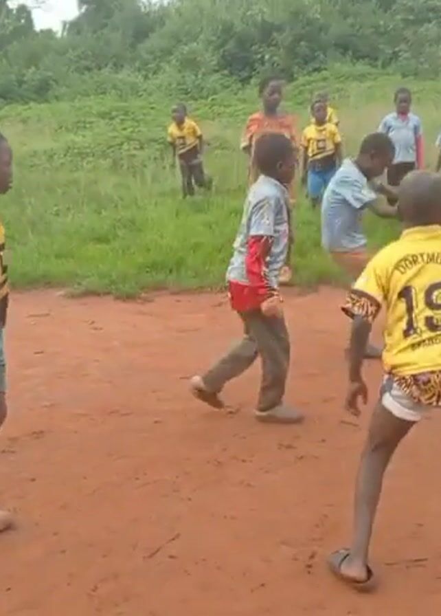 A group of approximately 14 children are playing soccer on a dirt field. Most of the children wear sandals or are barefoot. Some wear yellow soccer jerseys with the number 19 on the back. The field is surrounded by grass, trees, and several simple buildings in the background. Mountains are visible in the distance. The children are actively running and kicking a soccer ball.