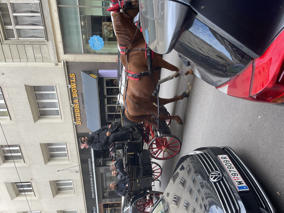 The image displays a traditional horse-drawn carriage (Fiaker) on a city street in Vienna, Austria