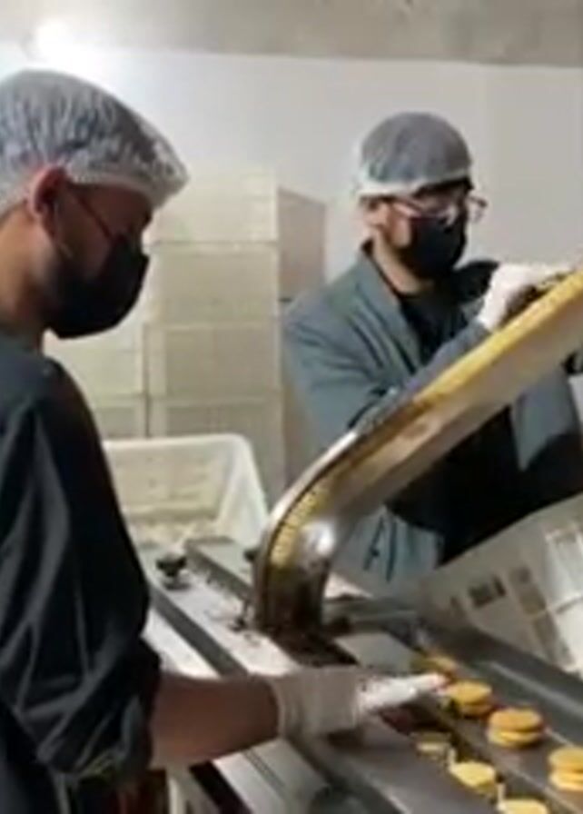 Two workers wearing hairnets, masks, and gloves are working on a cookie assembly line