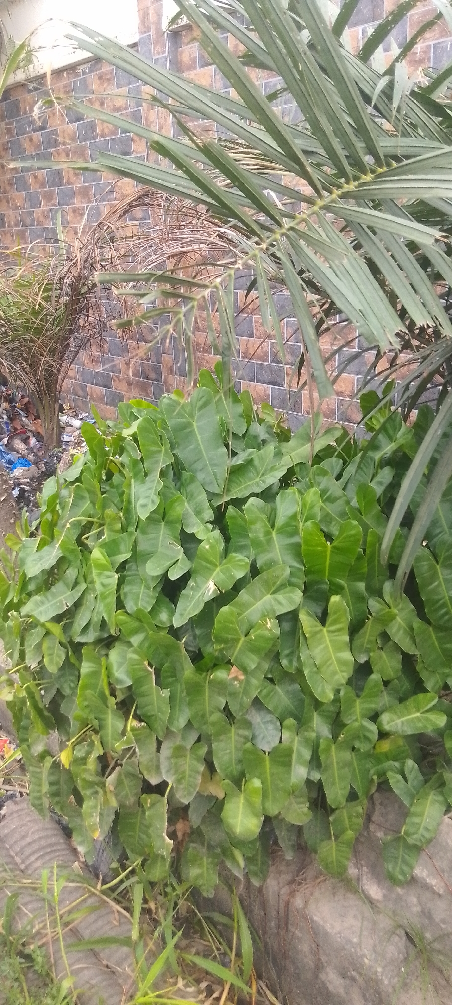 dense patch of green, heart-shaped leaves of a plant in front of a wall made of brown and grey bricks. To the right, there's a palm tree with long, thin leaves. To the left, there is another palm tree that is mostly brown and dry. A pile of trash is visible near the base of the brown palm tree. The photo seems to have been taken outdoors. A concrete curb is visible at the bottom of the frame, suggesting an urban or suburban location.