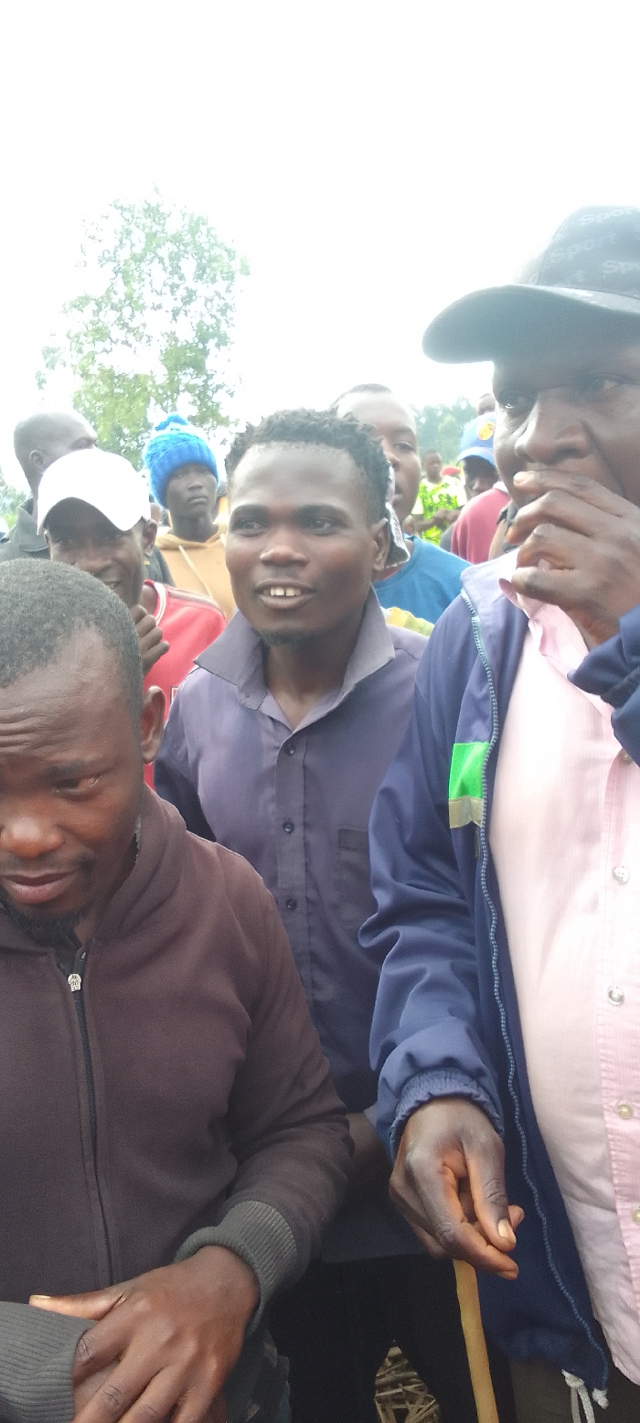 group of people standing together. The man in the center of the image is wearing a dark blue shirt. The man to his right is wearing a navy blue jacket over a pink shirt. The man to the left of the center man is wearing a red shirt. Another man wearing a brown jacket is in the foreground. The man in the navy blue jacket has his right hand raised, partially covering his face, and a green and white sticker on his jacket. The location is likely a rural area in Burundu, Kenya, based on the coordinates provided. The people are likely interacting in some way, possibly discussing a topic or exchanging goods. The environment is likely a community gathering place, with the presence of vegetation in the background. The overall mood of the image is neutral. The image appears to be taken by someone holding their phone up to take a selfie with the group.