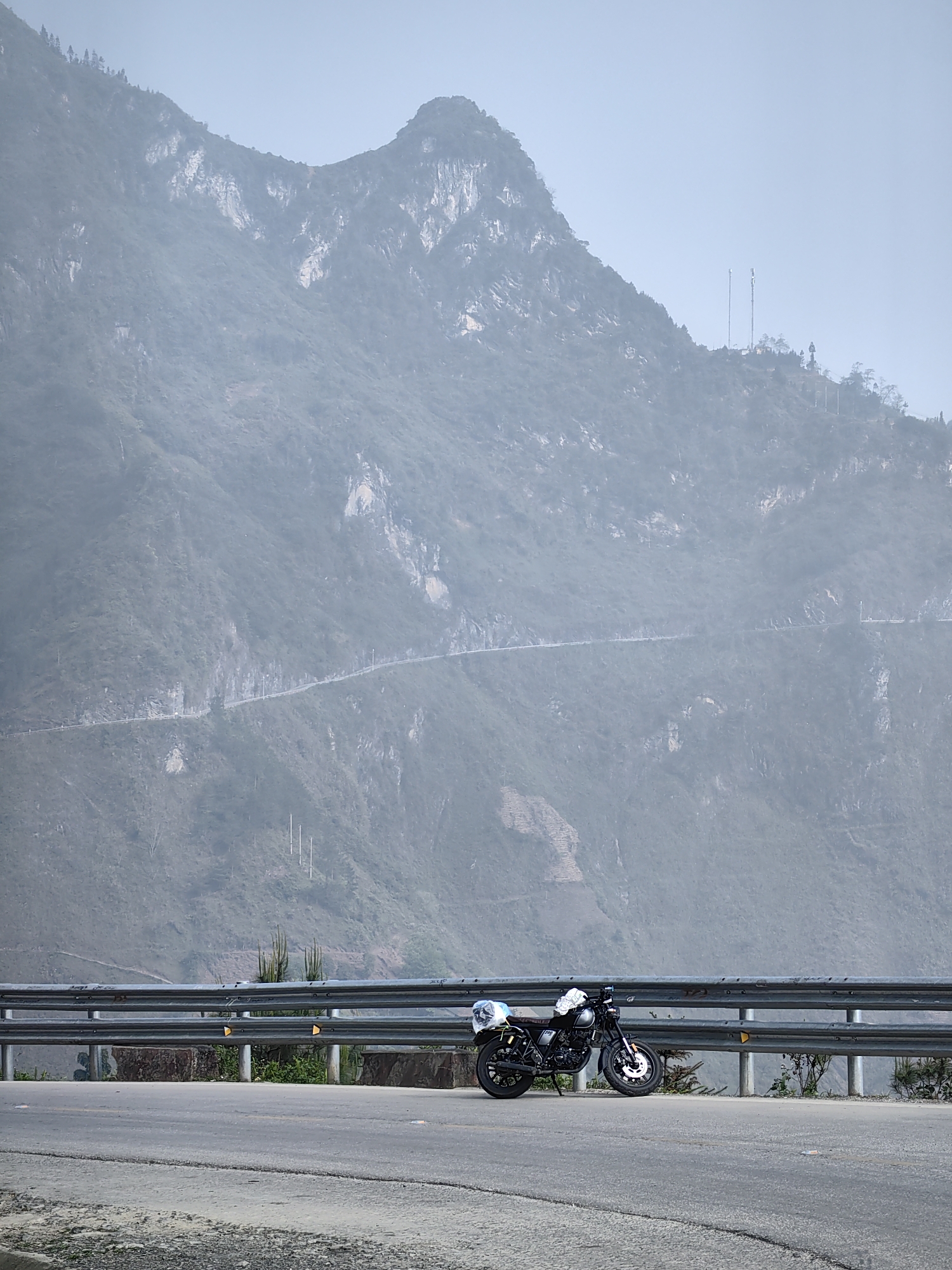 The image depicts a black motorcycle parked on a paved road next to a metal guardrail. Behind the guardrail is a steep, misty mountain partially obscuring the sky. A winding road is visible on the mountainside. Two communication towers can be seen at the top of the mountain. The location is likely in or near Mèo Vạc Commune, Vietnam, based on the mountainous terrain and road infrastructure.