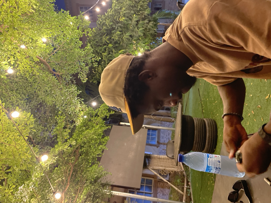 The scene depicts an outdoor evening or night setting in Alagba, Nigeria, illuminated by overhead string lights draped through dense green tree foliage. In the foreground, positioned to the right, a dark-skinned male subject is visible from the chest up, wearing a light brown t-shirt and a two-toned tan baseball cap with a blue "LA" logo on the front. He is looking downwards, focused on a small, dark, metallic object held in both hands. On a dark table surface to his left, a clear plastic water bottle with a blue cap, a pair of dark sunglasses, and a small white cylindrical object are present. In the mid-ground, a distinctive table fashioned from several stacked dark tires topped with a flat dark surface is visible, with a light-colored chair behind it. Further to the left, a large, blank, rectangular screen is mounted on a structure. Residential or commercial buildings with multiple windows are discernible in the background. The ground beneath is covered with green turf or artificial grass.
