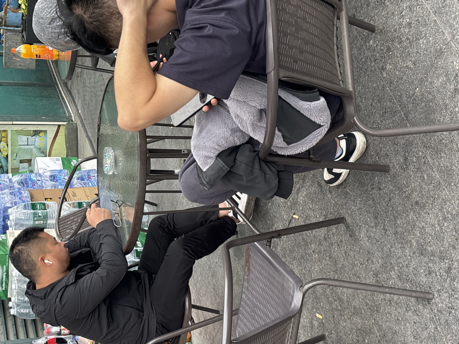 Two people are seated at a round table outside. One person wears a dark shirt, gray sweatpants, and black and white sneakers, and is holding a phone. The other wears a black jacket and pants, and has an earbud in their ear, along with glasses. There's a bottle of orange juice on the table, and multiple bottles of water are stacked behind them. The scene appears to be on a street, next to a building.