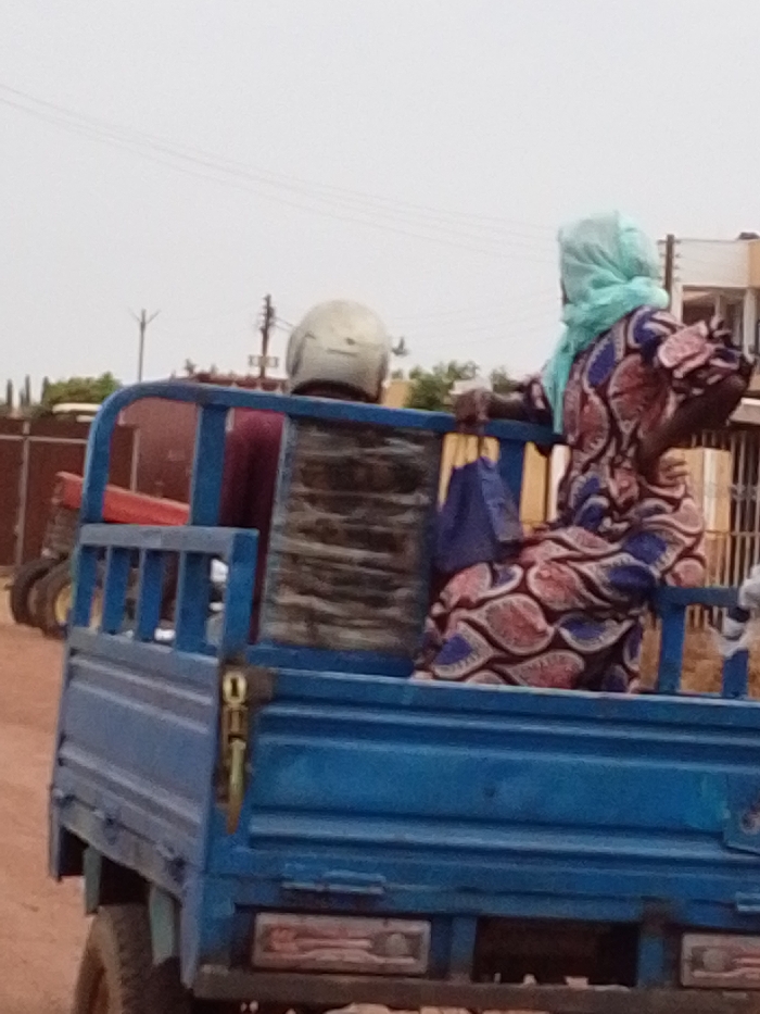 In Dungu, Ghana, a blue three-wheeled cargo vehicle, likely an auto-rickshaw or "Aboboyaa," is observed on a reddish-brown dirt road. Two individuals are passengers in the open cargo bed. One individual, positioned towards the front-left of the cargo bed, wears a maroon top and a light-colored helmet, facing away from the camera. The second individual, seated on the right side of the cargo bed, wears a light blue head covering and a patterned dress featuring blue, red, and off-white designs. This individual holds a dark blue bag. In the background, to the left of the blue vehicle, a red tractor is partially visible. Further structures, including fences, a building with a red roof, and a lighter-colored building, are present under an overcast sky, with utility poles and overhead wires also visible.