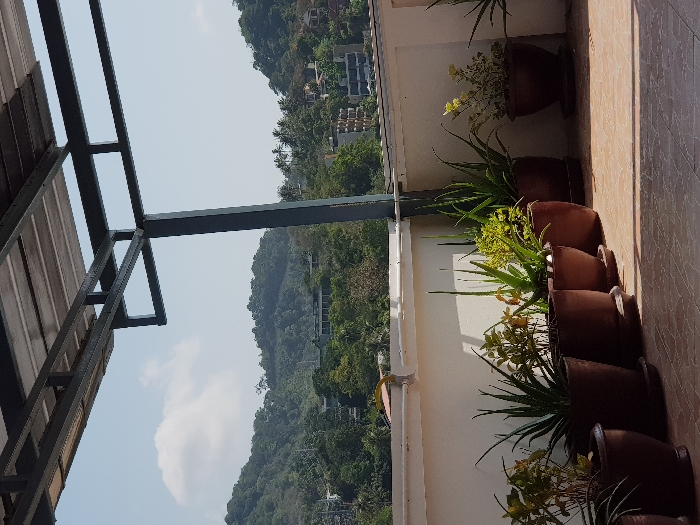 view from a balcony lined with a row of terracotta pots containing various plants. The pots sit against a white wall, next to a tiled floor. A metal frame structure is visible on the left, partially obscuring a view of a lush, green mountainside filled with trees and a few scattered buildings under a clear blue sky.