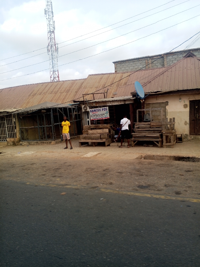 A street scene depicts a weathered building with corrugated metal roofing. A sign reads "KAMTEX POS." Three people are visible: one in a yellow shirt standing near the building's entrance, and two others closer to the doorway. Wooden structures resembling benches or stalls sit in front of the building. An asphalt road fills the lower portion of the frame. A tall communication tower rises in the background against a cloudy sky.