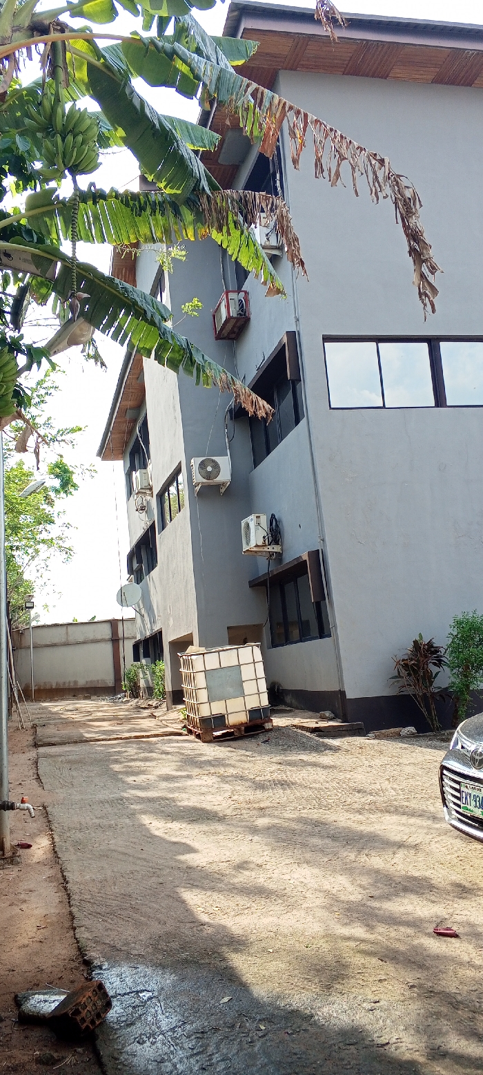 This image depicts an exterior view within Akure, Nigeria, capturing a multi-story building and its immediate surroundings