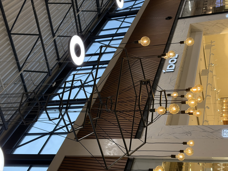 The image displays an interior view of a modern commercial establishment, likely a shopping mall, located in Kudrovo, Russia. The central focus is a multi-tiered, abstract geometric chandelier constructed from black metal hexagonal and rectangular frames, suspended from a high ceiling. Numerous exposed Edison-style light bulbs with visible filaments, emitting a warm orange-yellow glow, hang at various lengths from the lower sections of this chandelier. The ceiling features exposed metal structural elements, including trusses and corrugated panels. Several circular LED ring lights, emitting a bright white light, are flush-mounted to the ceiling. Along the upper wall, a series of large, rectangular windows reveal a clear, bright blue sky. Below the windows, a section of wall is clad in vertical wooden slats. Further down, a storefront facade with a light-colored, possibly marble-patterned, finish prominently displays the illuminated white sans-serif lettering "İDOL." No individuals are present in the scene.