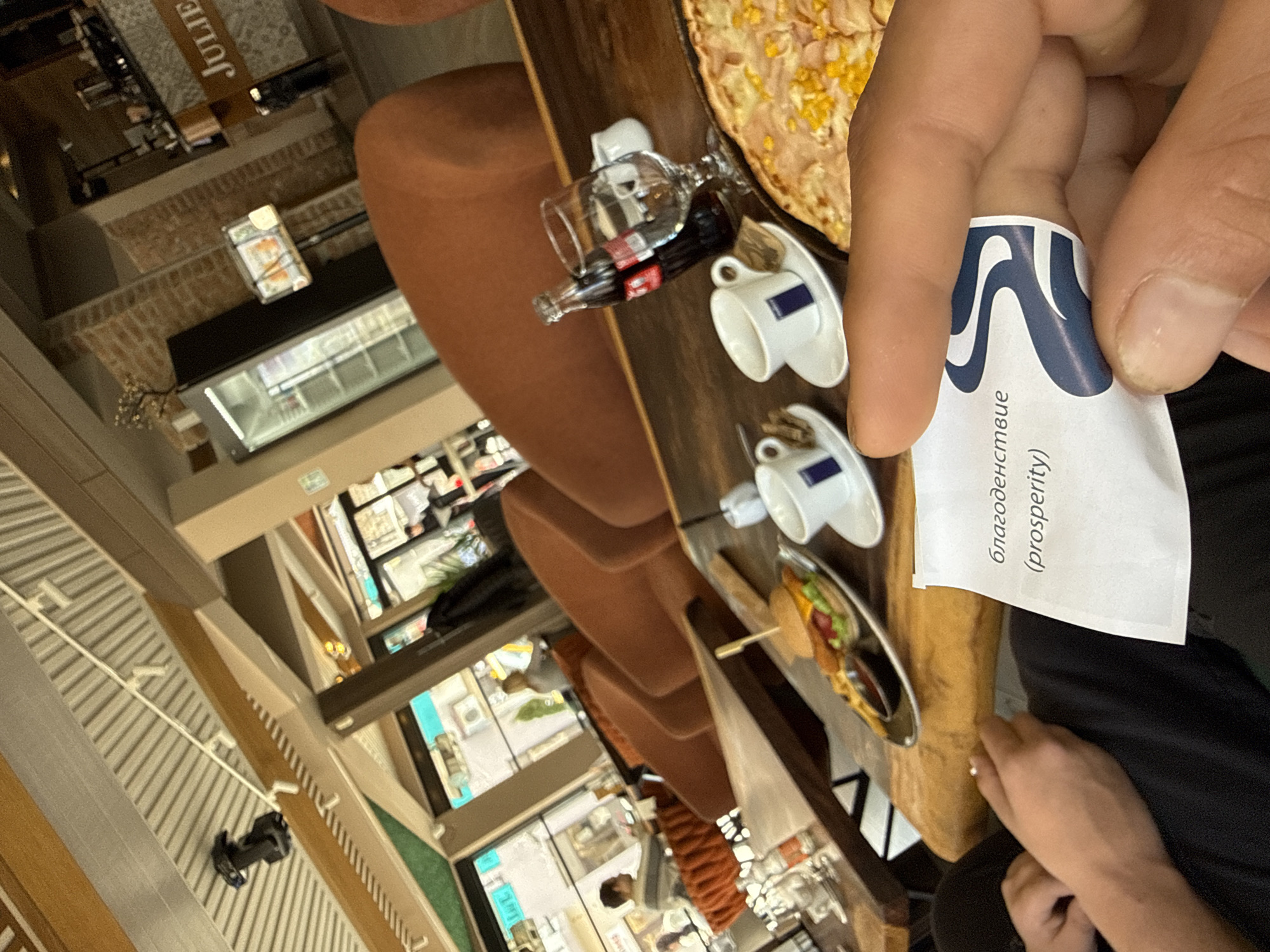 person holding a piece of paper with Cyrillic text that includes the word "prosperity" in English, likely a fortune from a fortune cookie