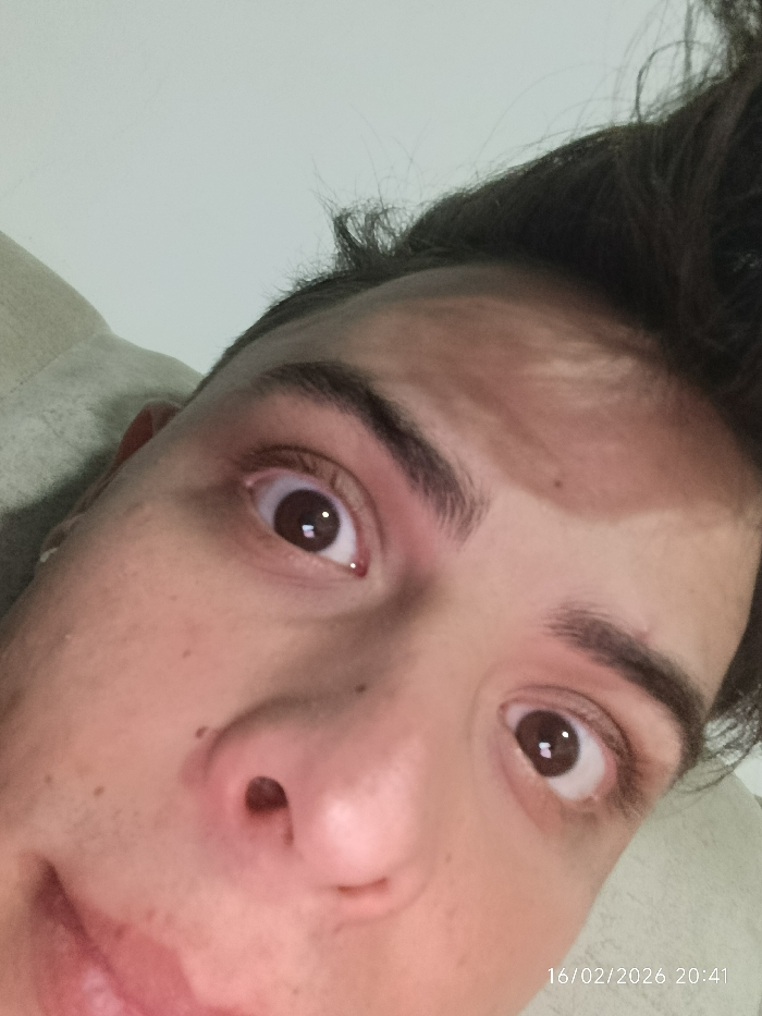 A close-up, angled view of a person's face, predominantly featuring their eyes, nose, and forehead. The person has dark hair and brown eyes. Skin blemishes are visible. The date "16/02/2026 20:41" is printed in the lower right corner. The background suggests the person is reclining on a soft surface. The lighting appears to be soft and diffused. The subject's gaze is directed upwards and to the left.