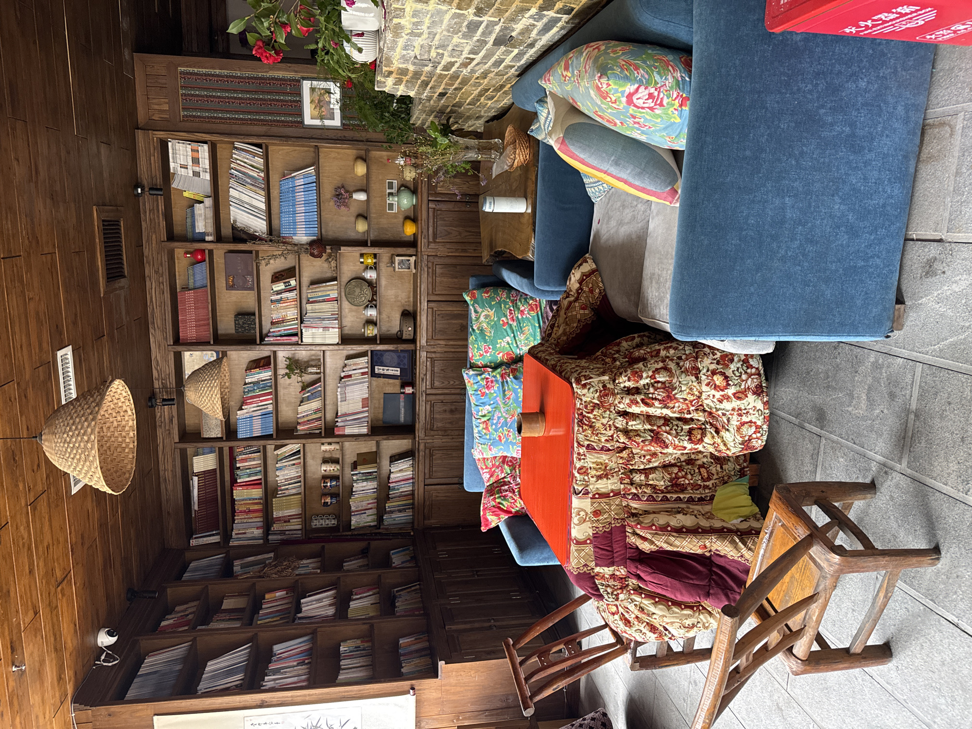 An interior shot depicts a cozy, well-furnished room, likely a lounge or common area, characterized by extensive wooden shelving and diverse seating arrangements. The setting is identified as being within the city of Wulingyuan, China. The room features a dark wood plank ceiling, from which two conical, woven straw pendant lamps and a white security camera are suspended. The floor is composed of light grey rectangular stone or tile pavers. The walls are largely covered by dark wooden bookshelves that extend from floor to ceiling, filled with numerous books and various decorative items such as vases, ceramic mugs, and small framed pictures. A large white scroll with black calligraphy hangs on the leftmost bookshelf unit. A section of exposed light brown brick wall is visible on the right side of the room. Two distinct seating areas are present. In the center-left, a traditional *kotatsu*-style table with a bright red square top is visible. The table is draped with a voluminous, multi-patterned fabric skirt in red, cream, and floral designs. Two rustic wooden chairs with slatted backs and seats are positioned around this table. Behind this setup, a blue upholstered sofa with vibrant green floral pillows is partially visible. To the right, an L-shaped arrangement of blue upholstered sofas is set around an irregularly shaped, natural wood coffee table. This table holds a white thermos or water bottle, a small woven basket containing snacks, and a clear glass vase with dried flowers. The sofas are adorned with patterned cushions, including floral and striped designs in blues, pinks, and yellows. Potted plants with green foliage are placed throughout the room, and a prominent white pot holding red-flowering plants rests on top of the brick wall to the right. A red box with Chinese characters is partially visible in the bottom right corner. No individuals are present in the scene, and no specific actions are occurring. The overall environment suggests a space designed for relaxation, reading, and social interaction.