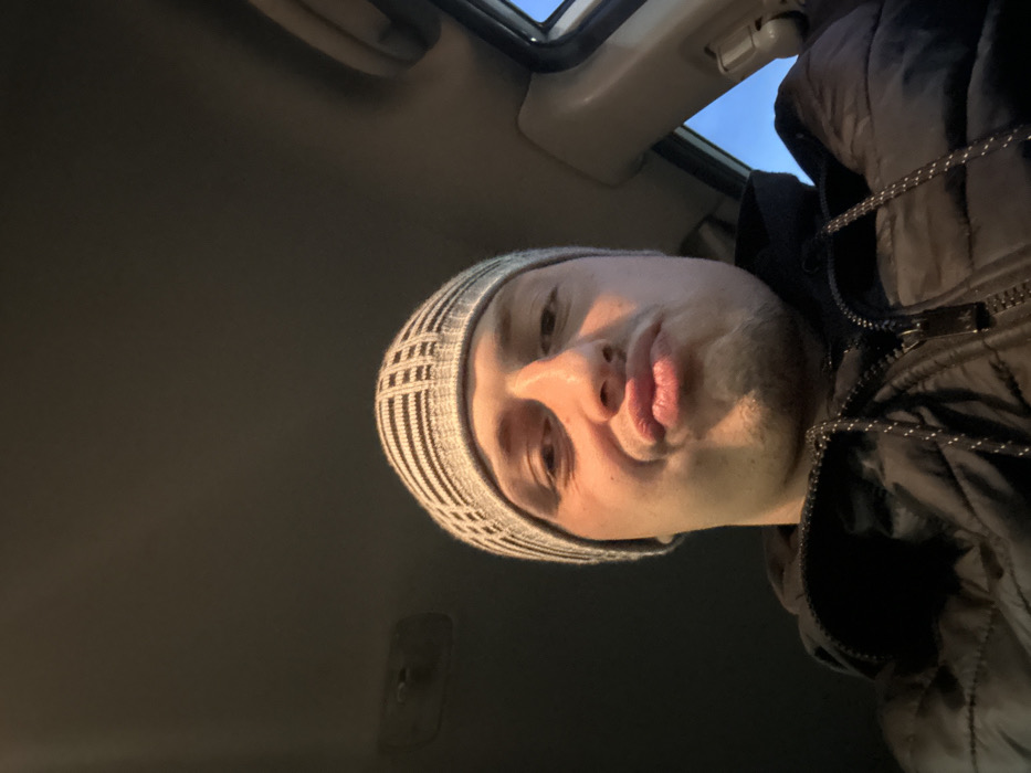 A male individual is depicted in a close-up, low-angle selfie, positioned inside what appears to be a vehicle