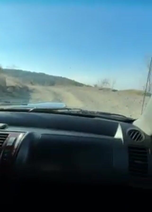 view from inside a car driving on a dirt road, likely in a rural or hilly area