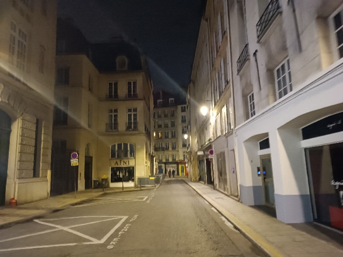 A quiet Parisian street at night features buildings with classic architecture. Street markings indicate a parking zone. A brightly lit storefront labeled "AÏNI" stands on the left. On the right, a store with a modern white facade and an arched entrance contrasts with the older buildings. A lamppost illuminates the street, casting light down the center towards distant figures under orange light near the end of the street.