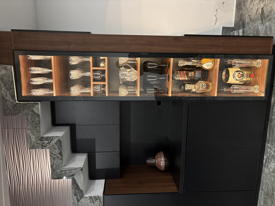 A modern bar unit is presented. The top section features a lighted display case with crystal glassware and liquor bottles. Below, black cabinetry contrasts with the warm wood trim of the case. A decorative vase sits on a small shelf. To the side, a stair-step-like design is constructed from textured gray material, adding a unique architectural element.
