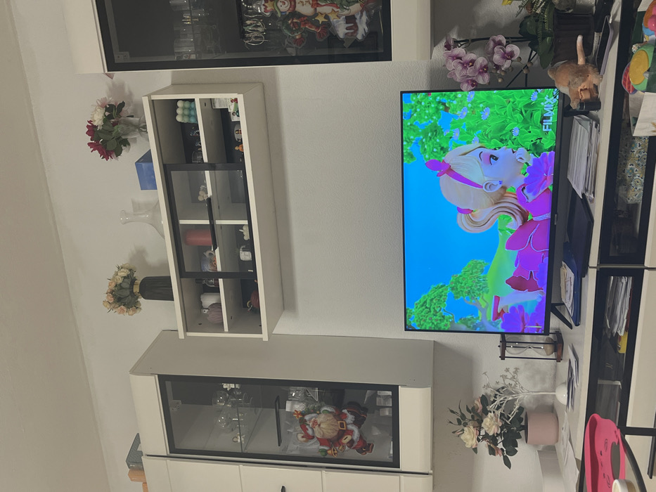 A living room wall has three white cabinets and a television. The top cabinet contains glass and decorative items. The middle cabinet is white with black-framed glass doors and includes various items like candles and ceramics. The bottom cabinet is white with a glass door. The television displays a cartoon character. Floral arrangements and decorative figures are near the TV and cabinets.