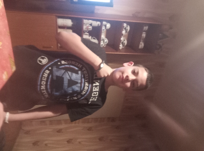 The image displays a young male individual, appearing to be in his early to mid-teens, positioned centrally in an indoor residential setting. The specific location within the city of Roman, Bulgaria, cannot be visually determined. The subject has short, dark hair and is looking directly at the camera with a neutral expression. He is wearing a dark, short-sleeved t-shirt with a prominent, mirrored graphic featuring the word "LEGEND" across the top, a stylized 'A' logo in the center, and the word "AVENGERS" mirrored below it, flanked by "HEROES" and "NIGHTMARES." A dark-colored wristwatch is on his left wrist, and a light-colored bracelet on his right wrist. His left hand is raised, with the fist lightly clenched and positioned below his chin, while his right arm hangs beside him. To the left of the subject, a tall, wooden display cabinet or hutch occupies the background. Its shelves contain various ceramic items, primarily mugs and cups, some appearing white with dark accents, resembling collectible Stormtrooper helmets. Below these, several white, cylindrical objects are visible. A portion of an illuminated television screen or monitor is partially visible on the extreme left. To the right of the subject, the background consists of a wall covered with patterned wallpaper, predominantly in light brown or beige tones, featuring a repeating, possibly abstract or leaf-like design. A reddish-orange surface with a subtle pattern, likely a tablecloth or tabletop, is visible in the immediate foreground, extending across the bottom edge of the frame. The scene is illuminated by artificial lighting, which casts soft shadows.