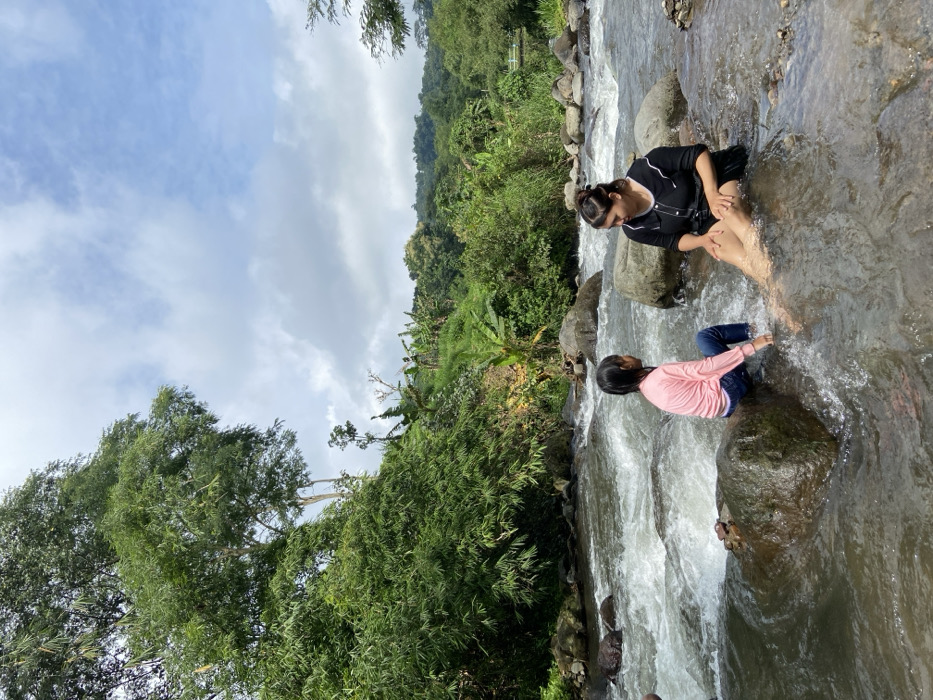 A woman and child sit on rocks in a shallow, rushing stream. The woman wears a dark shirt and shorts, with her legs in the water. The child is positioned on a separate rock, wearing a pink shirt and jeans. The water surrounds them and splashes as it flows. Lush green vegetation covers the riverbank and hillside, extending into the distance under a cloudy sky.