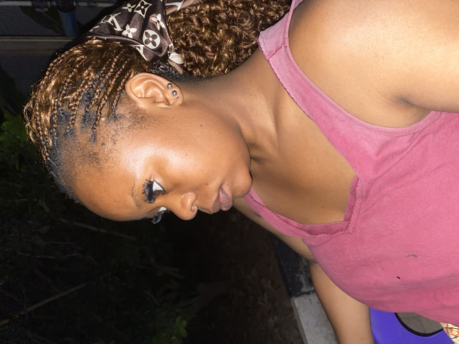 A woman with braided hair and a brown patterned scarf is shown from the chest up. She wears a pink tank top. The woman looks down and to the left. Her ear has two piercings. She has long false eyelashes. A dark background is present behind her, with some greenery visible.
