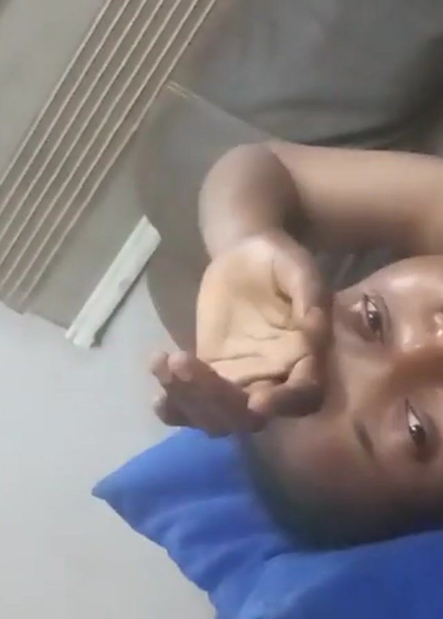 A woman is lying on a couch, resting her head on a blue pillow. She's wearing a red top with white straps. Her right arm is extended towards the upper left corner of the frame. She's looking directly at the camera. Behind her, there is a grey couch and a white wall with striped blinds.