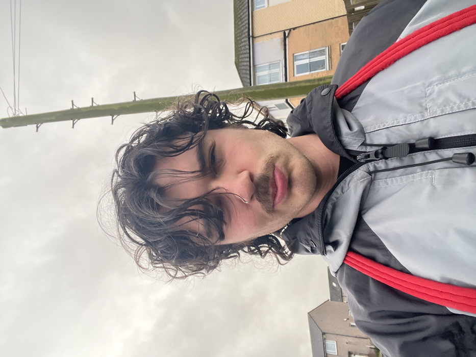 The scene captures a single male subject in a close-up, slightly low-angle, outdoor portrait. The subject, an adult male, has dark, curly, medium-length hair, a dark mustache, and a small soul patch. A silver-toned hoop piercing is present in his left nostril. His eyes are dark, and his lips are slightly pursed. He wears a two-tone jacket, light grey on the lower torso and dark grey on the upper torso and shoulders, featuring a central zipper with a black pull and toggles. A red cord or strap is visible over his right shoulder. The background is an overcast, light grey sky. To the right, a tall, slender utility pole with multiple dark horizontal attachments is present. Residential structures are visible behind the subject: a two-story house with a dark roof and light walls on the left, and a two-story building with a light brown brick lower facade and a dark roof on the right. The location is an outdoor, residential area within the city of Unknown, Unknown.