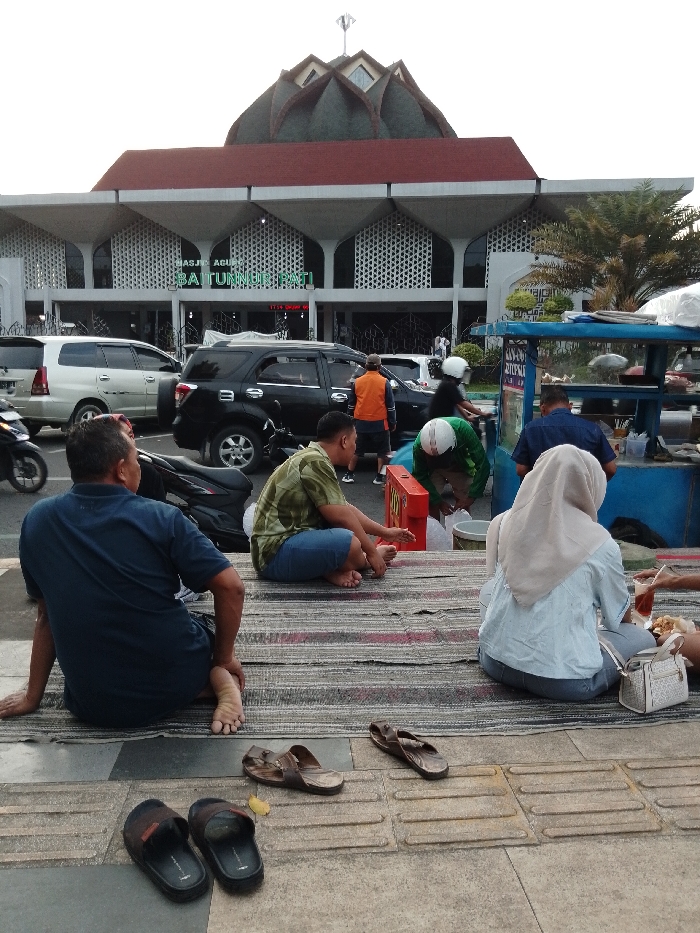 This image depicts an urban scene in Kecamatan Pati, Indonesia, with Masjid Agung Baitunnur Pati prominently featured in the background. The mosque displays a white facade with geometric patterned screens, a red roofline, and a multi-tiered, lotus-shaped green dome topped with a finial. Signs reading "MASJID AGUNG BAITUNNUR PATI" and "Jl. Pemuda No. 1 Pati" are visible on the mosque's exterior. In the foreground, several individuals are seated on a striped woven mat laid directly on a sidewalk. From left to right, a barefoot male in a dark blue short-sleeved shirt is seated with his back mostly to the viewer, looking towards the right. To his right, another barefoot male in a patterned green short-sleeved shirt and blue shorts is seated, facing right. Further right, a female wearing a light blue top and a beige hijab is seated with her back to the viewer, holding a clear plastic cup with a straw and a food item. Next to her, a white patterned handbag is visible on the mat. Three pairs of sandals/slippers are placed on the concrete sidewalk adjacent to the mat. In the midground, a blue mobile food cart is positioned to the right, with a vendor partially visible behind it. A person wearing a green shirt and a white helmet is bending over a red container on the ground next to the food cart. Other individuals are present in the background, including a person in an orange vest near a black SUV, and a person on a motorcycle with a white helmet. A white van and a black SUV are parked on the street in front of the mosque, with other vehicles and a palm tree also visible. The overall lighting suggests daytime conditions.