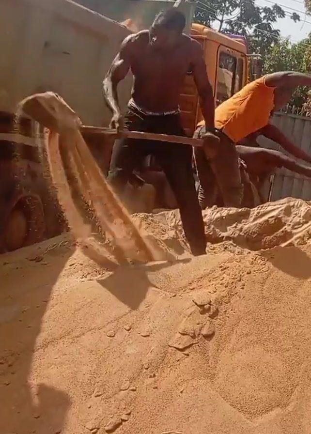 three men shoveling sand from a large pile next to a truck. One man is shirtless, wearing black pants. Another man wears an orange shirt with "GW 23" printed on it. The third man is partially obscured. They are using shovels to move the sand, which is a light brown color. The truck is a faded green with orange details on the cab. The environment appears to be outdoors with trees visible in the background. The weather seems sunny.