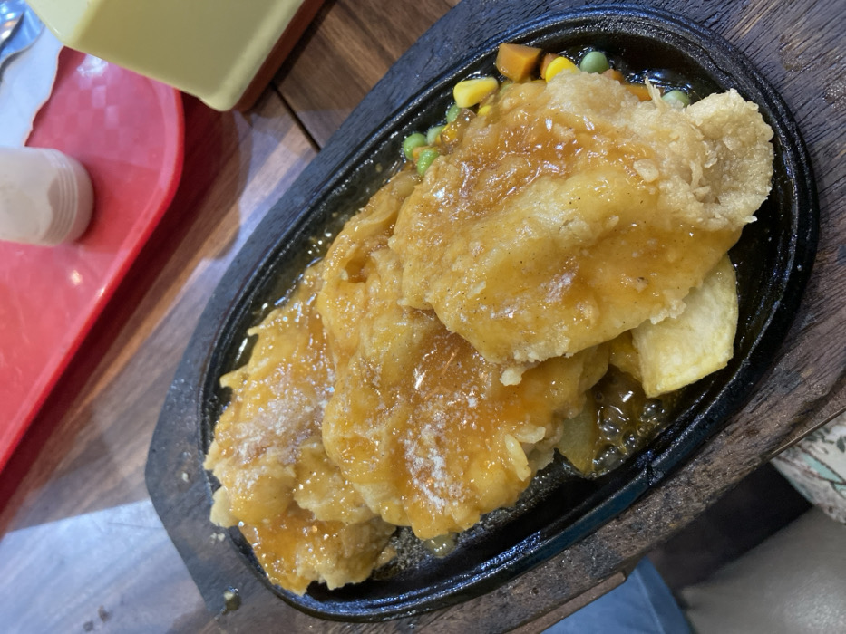 An overhead shot depicts a prepared meal served on a wooden plank table in Sidoarjo, Indonesia. The central subject is an oval-shaped black cast iron sizzling plate, resting on a dark brown wooden base. The plate contains three pieces of golden-brown, breaded cutlets, possibly chicken or fish, covered in a glossy, amber-colored sauce. A light dusting of white seasoning is visible on the sauce. Accompanying the cutlets are several potato wedges or slices and a small portion of mixed vegetables, including green peas, yellow corn kernels, and orange diced carrots. Small bubbles are present in the sauce, indicating the plate's heat. In the blurred background, a red plastic tray holds a white cylindrical shaker and a cream-colored object, likely a condiment holder. No individuals are visible.