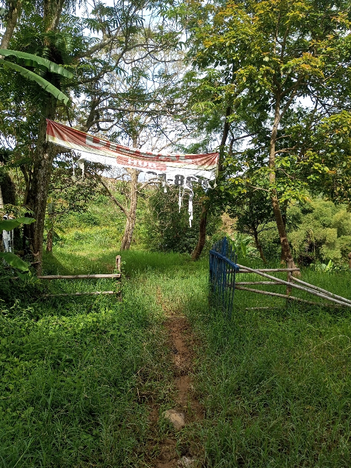 A path leads through tall grass towards an opening framed by trees. A weathered banner hangs between the trees, displaying tattered edges and faded text with numbers. A makeshift gate, constructed from wood and painted blue, stands slightly ajar on the right side of the path. The scene exudes a sense of abandonment and natural overgrowth.