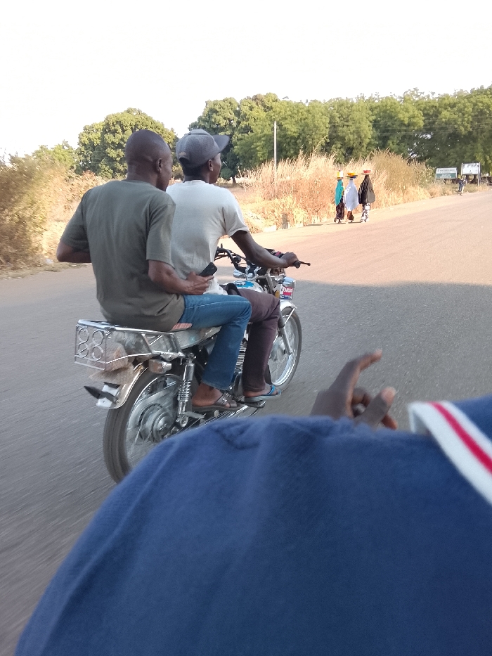 The image captures a daytime scene on a paved road in Wukari, Nigeria. Two adult males are prominently featured in the midground, riding a silver-colored motorcycle away from the camera. The rear passenger, with a bald head, wears an olive-green t-shirt and blue jeans, holding a black smartphone in his left hand. The driver, wearing a white t-shirt and a grey baseball cap, operates the motorcycle, his feet clad in sandals resting on the footpegs. The motorcycle is equipped with a chrome rear rack, which has a woven item attached. In the background, on the right side of the road, four individuals are walking in the same direction as the motorcycle. These individuals, primarily identifiable by their head coverings and traditional attire, are carrying various items balanced on their heads. The environment consists of dry, light-brown shrubbery and grass lining the road, with denser green trees in the distant background. A white signpost is visible on the right side of the road behind the pedestrians. The lower right foreground of the image shows a partial view of a dark blue garment with a red and white striped collar, and a dark-skinned hand with curled fingers, indicating the perspective from another moving vehicle.