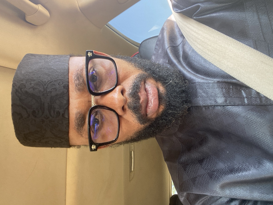 An adult male with a dark complexion and a full black beard is depicted in a close-up, chest-up shot. He is wearing a black, subtly patterned cap and thick black-framed glasses with gold-colored crown motifs on the outer top corners. His eyes are visible through the reflective lenses, and his lips are closed in a neutral expression. He wears a black long-sleeved garment with a textured, geometric pattern. A beige seatbelt is visible diagonally across his chest and right shoulder, indicating he is seated in a vehicle. The background shows a light-colored vehicle headliner and a clear blue sky through a window on the right. This scene is located in Jos, Nigeria.