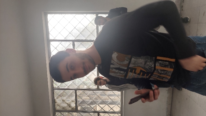 An indoor scene within Ash-Shaghour Municipality, Syria, shows three males. In the foreground, a male with dark hair and a short beard is positioned slightly off-center to the right, facing the viewer with a slight smile. He wears a black long-sleeved t-shirt with a "NYC" graphic design in white, grey, and orange tones, and blue jeans. He holds a dark-colored smartphone in his raised right hand, and his left hand is in his front left pants pocket. In the mid-ground, behind the primary subject, two other males are visible. To the left, a male wearing glasses and a light-colored hoodie over a dark shirt is leaning against a wall or window frame, looking towards the right. To the right, another male with dark hair, wearing a dark shirt, is partially visible, facing left, with his features partially obscured by bright light. The background is dominated by a large, multi-pane window featuring a diamond-shaped grid pattern on its glass or framework, which appears somewhat opaque and soiled. Bright natural light enters the room through this window. The interior space has light-colored walls and a light-colored floor.