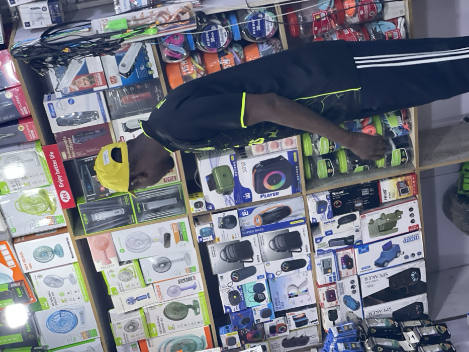 The image displays an indoor retail environment, identified as an electronics and general goods shop in Chikaji, Nigeria
