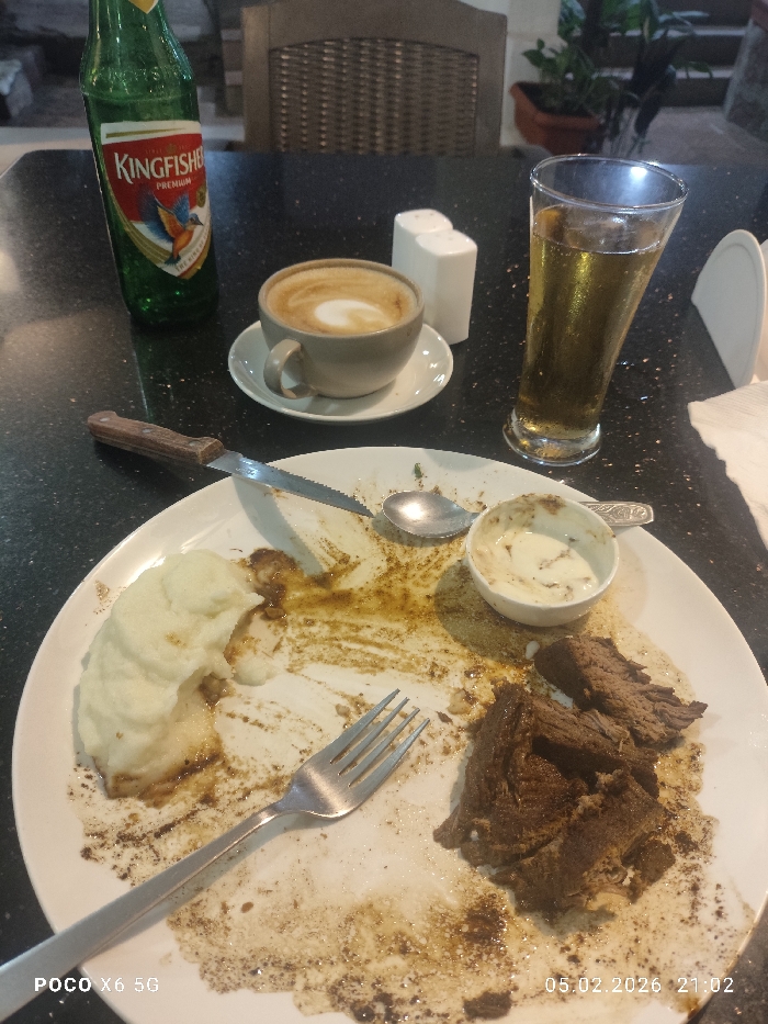 A partially eaten meal sits on a white plate with a fork and knife. Mashed potatoes and slices of dark meat are visible, surrounded by remnants of sauce. A small bowl with creamy sauce is on the side. A bottle of Kingfisher beer, a cappuccino, a glass of beer, and salt and pepper shakers are on the table. A tissue is beside the plate. The table has a dark speckled surface. The date 05.02.2026 21:02 is visible at the bottom.